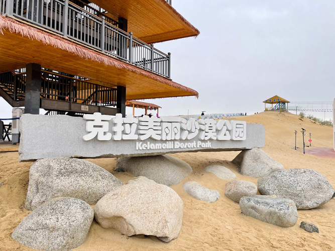 8月31日下午,考察团成员乘车穿越S21沙漠公路的途中,来到了克拉美丽沙漠公园。该公园位于新疆阿勒泰地区福海县境内,在S21阿乌高速克拉美丽服务区东侧,地处古尔班通古特沙漠,是北疆首个综合性沙漠主题公园。团员们进入公园,不约而同地登上了沙漠之门观景台,大家远眺古尔班通古特沙漠与福海的交界线,立即感受到金色沙海与碧蓝湖水形成的视觉对比的强烈震撼。在这里,沙漠起伏的每一道曲线都是大自然的杰作,浩瀚沙海中的每一粒沙子,都诉说着千年孤独和壮美。