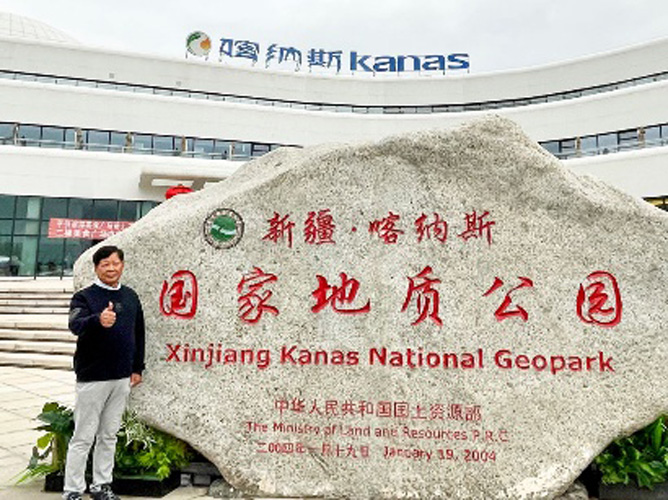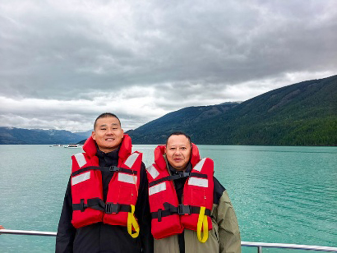9月2日上午,考察团成员来到被誉为“人间仙境、神的花园”的喀纳斯湖。喀纳斯湖位于阿勒泰地区布尔津县北部,湖面海拔1374米,面积近46平方公里,湖深188.5米,是一个坐落在阿尔泰深山密林中的高山湖泊、内陆淡水湖。大家乘船游览了湖景,并分别游览了神仙湾、月亮湾、卧龙湾。神仙湾位于喀纳斯湖下游起始段,因清晨薄雾笼罩如仙境而得名,由于突降大雨,团员们虽然没能看到雾气与阳光交织时湖面如撒珍珠的场景,但还是能够站在木栈道上近距离观赏浅滩与泰加林。月亮湾距神仙湾约3公里,河道迂回,形似新月,以曲线美和倒影景观著称。团员们站在观景台上,把层林尽染的秋景尽收眼底。卧龙湾最靠近贾登峪方向,因河心沙洲形如卧龙而得名,大家驻足眺望,无不为大自然的波澜壮阔、鬼斧神工而折服。