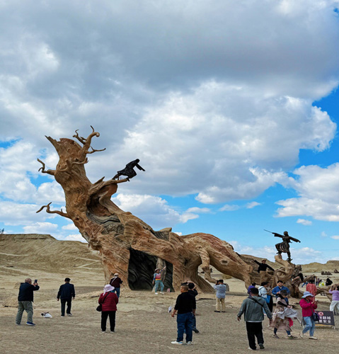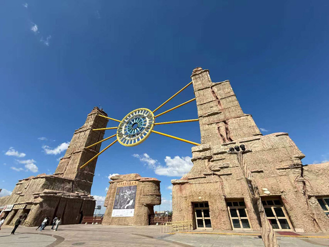 9月3日,考察团成员来到了新疆克拉玛依市世界魔鬼城景区。在风蚀奇观处,团员们被石柱林立、千姿百态的造型所吸引,那惟妙惟肖的“狮身人面像”,那栩栩如生的“孔雀开屏”石像,在日落时金光洒落、庄严肃默,既令人震撼不已,又令人遐想无限。在影视取景地,团员们来到曾是《七剑下天山》、《卧虎藏龙》等电影的拍摄地,回想经典场景,感受雄姿英发,不由地豪情满怀,意气风发。在油田体验区,团员们远眺戈壁上的石油抽油机(“磕头机”),既目睹了现代工业的景观,又感受到自然与人文的碰撞交融。置身于魔鬼城里,团员们不仅听到了狂风的呼啸,而且感受到历史的回声。大家都意识到,这里的每一块石头,每一粒沙子,仿佛都在诉说着关于它们的古老故事。