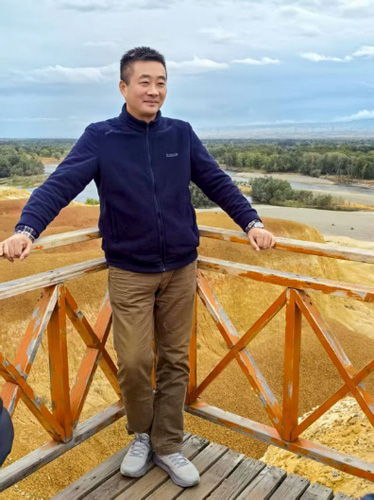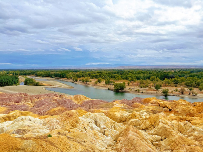 9月2日下午,考察团来到了五彩滩。五彩滩是阿勒泰布尔津县的一处4A级景区,以色彩斑斓的雅丹地貌和额尔齐斯河两岸的奇幻景观闻名,被誉为“新疆最美的雅丹地貌”。夕阳西下时分,团员们看着岩石在阳光下色彩变幻,领略到了“上帝打翻的调色盘”所蕴含的独特魅力。同时,大家也欣赏到了“一河两岸奇观”,北岸为彩色雅丹群丘,南岸是绿洲与胡杨林,额尔齐斯河从中流过,形成了“火焰与绿洲”的强烈对照。