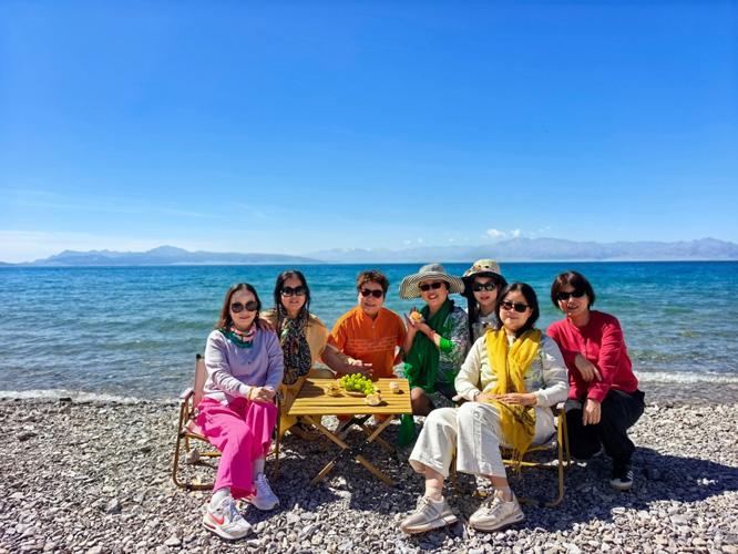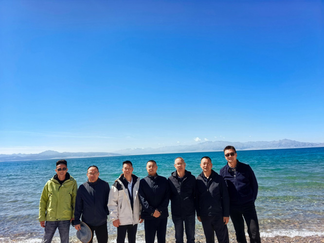9月4日,考察团成员来到了新疆博乐市境内的赛里木湖景区。赛里木湖融高山、冰川、森林、草原、碧湖和珍禽为一体,集雄、奇、幽、秀、旷诸美于一身,是新疆海拔最高、面积最大的高山湖泊,被誉为“大西洋最后一滴眼泪”,享有“西来之异境,世外之灵壤”的美名。在月亮湾景点,团员们被波光粼粼、浮光跃金的湖面所吸引,更为千姿百态、千变万化的湖水颜色所折服。由近而远,展现在团员们眼前的湖水时而浅蓝、淡蓝、鹅黄蓝,时而翡翠蓝、墨绿蓝、紫褐蓝,时而湛蓝、乌蓝、黛蓝。在亲水滩景点,团员看到景区最高的巨石矗立在湖边,上面刻有“西域净海、赛里木湖”八个大字。因其形似船帆,有人把它称作“风帆石”;又因一条小溪常年从此流入湖中,溪流又叫作“风帆溪”。在点将台景点,团员们站在点将台遗址公园的最高处,看到直径达13米的敖包。敖包两边各有4个高大的旗杆,象征着蒙古族八旗。团员们身临其境,不禁想起八百年前成吉思汗率二十万大军,金戈铁马、一路西征的历史。